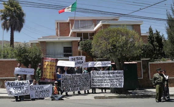 Con mantas y fotografías de los normalistas desaparecidos, en Bolivia varios jóvenes protestan frente a la representación de México en el país. "¡Ya basta de desapariciones, asesinatos y encarcelamientos!, y Bolivia acompaña a México, son algunas de las consignas que se pueden leer en las mantas de los manifestantes.