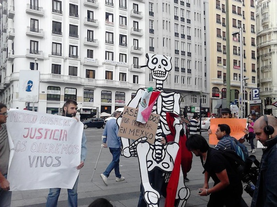 En la Plaza de Carballo, en Madrid, España, ciudadanos exigieron que aparezcan con vida los 43 normalistas desparecidos. "Asesinados por protestar en México", dicen una manta colgada a un esqueleto que luce la bandera de nuestro país.