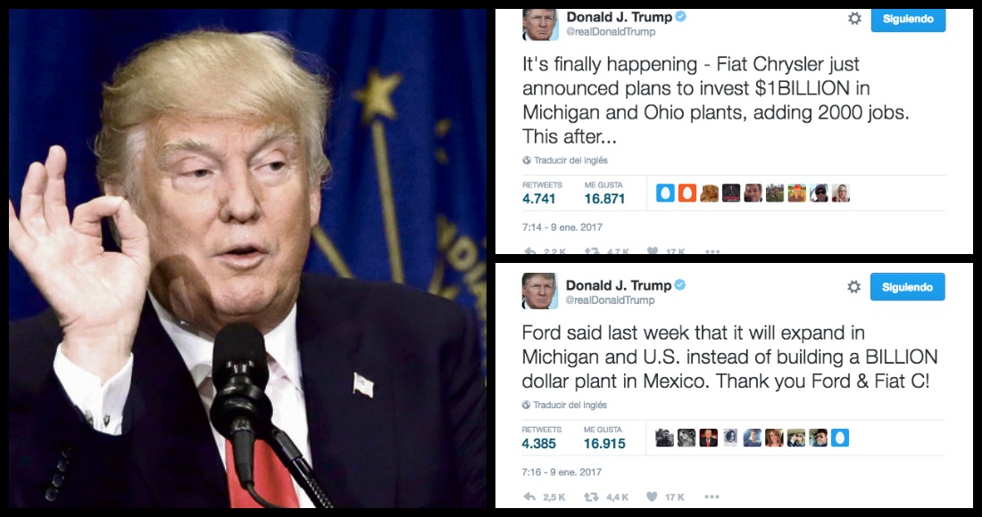 Hoy Trump agradeció en Twitter a Fiat Chrysler el anuncio realizado el domingo por el fabricante de que invertirá mil millones de dólares en Estados Unidos y creará dos mil empleos.
