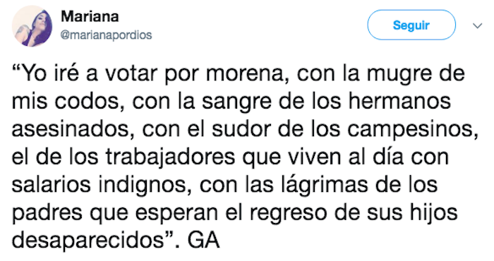 Ciudad de México, 9 de junio (SinEmbargo).- “Yo iré a votar por Morena, con la mugre de mis codos, con la sangre de los hermanos asesinados, con el sudor de los campesinos, el de los trabajadores que viven al día con salarios indignos, con las lágrimas de los padres que esperan el regreso de sus hijos desaparecidos”, es el mensaje.