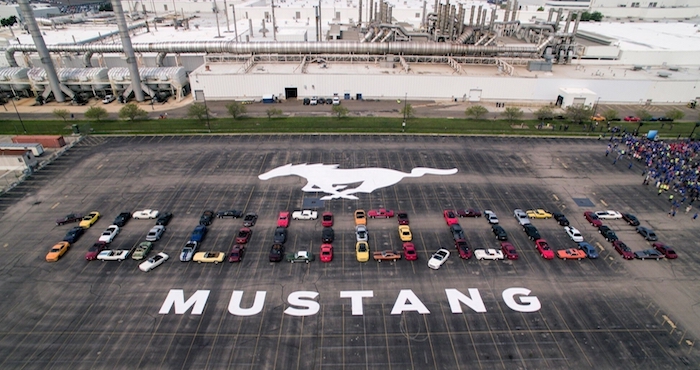 Un desfile de Mustang de 1964 a la actualidad salió al estacionamiento en la sede de Dearborn antes de hacer el recorrido de 30 minutos, con todo y escolta policial, al complejo de Flat Rock. Ahí, los autos fueron acomodados para escribir “10,000,000”. Para las comas utilizaron el primer Mustang producido y el diezmillonésimo, un convertible manual de seis velocidades Wimbledon White GT V8 modelo 2019.