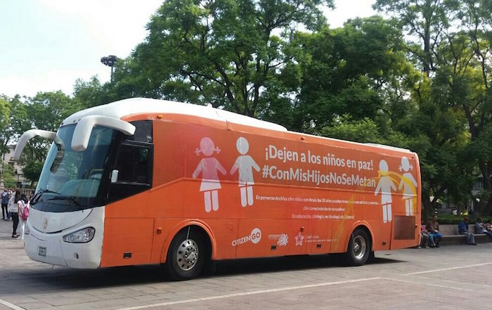 Con una fuerte vigilancia policial, un autobús de color naranja identificado con el lema "¡Dejen a los niños en paz! #Conmishijosnosemetan" circuló durante la mañana de este lunes por las principales avenidas de la capital chilena.