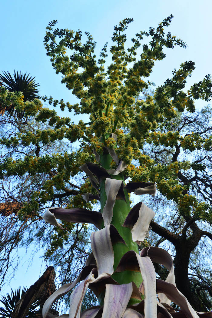 La Furcraea longaeva, una de las especies con más larga vida en el mundo, puede tener hasta 50 mil flores blancas con tonalidades verdes que con el paso de los días se tornan amarillas y naranjas. Es la tercera vez que en la UNAM florece una Furcraea, pero las otras no eran del mismo tipo.