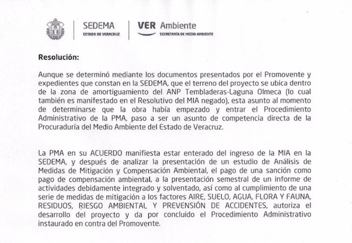 El dictamen en poder de Plumas Libres y firmado por la Julio Antonio Flores Guevara director general de Gestión Ambiental y Recursos Naturales de Sedema, el pasado 31 de enero, autoriza a la inmobiliaria el desarrollo del proyecto con la condición de llevar a cabo acciones de ‘mitigación’ para que no ‘afecte la flora y fauna’ en esa zona de humedales ubicada al sur de la ciudad de Veracruz.