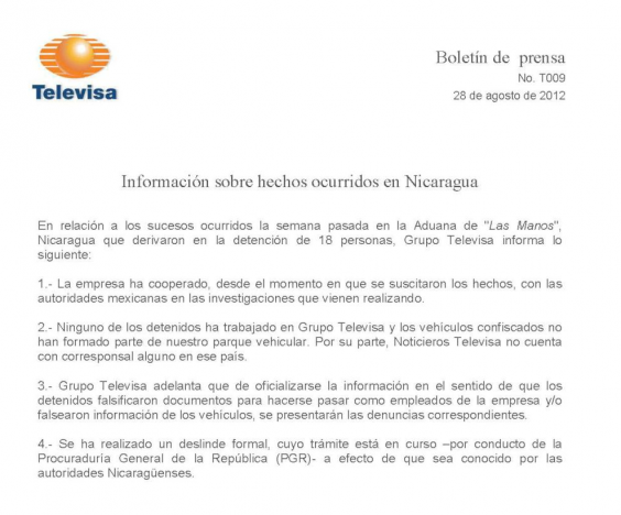 En respuesta, Televisa afirmó que "ha sido víctima de un delito y consecuentemente ha presentado la denuncia correspondiente y continuará coadyuvando con todas las autoridades para que se conozca la verdad de los hechos y se consigne a los responsables. Cualquier otra aseveración está basada en especulaciones infundadas" y rechazó que los vehículos retenidos en Nicaragua hayan sido “adquiridos o registrados ante autoridad alguna por esta empresa”.