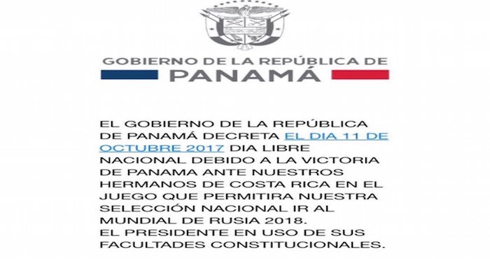 Panamá clasificó a su primer mundial y para celebrarlo, el Gobierno decretó "día de fiesta nacional". "Mañana será libre para los trabajadores del sector público y privado", escribió el mandatario canalero, Juan Carlos Varela, a través de su cuenta de Twitter.