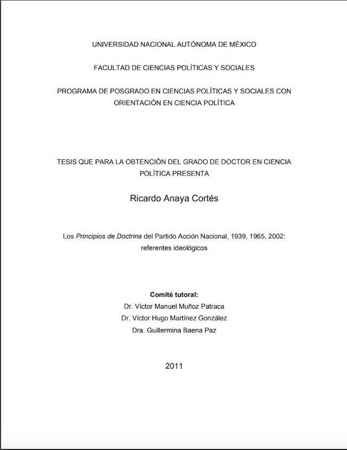 Así quedó plasmado en la tesis doctoral que Anaya presentó en 2011 en la Facultad de Ciencias Políticas y Sociales de la Universidad Nacional Autónoma de México (UNAM).