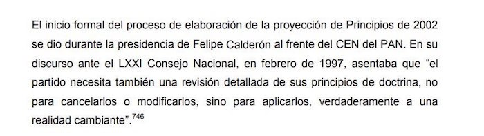 “Calderón enfatizaba que había ‘nuevas realidades’ como ‘la globalización, el deterioro del medio ambiente, la recomposición de la familia tradicional. El crecimiento demográfico o la transformación de la fuerza laboral’, entre otros muchos temas, que aún no estaban ‘suficientemente desarrollados’ por la doctrina panista. Agregaba que era imperativo ‘llevar adelante una proyección doctrinaria que lance con decisión y seguridad programática al partido de cara al próximo siglo. Que coloque al PAN donde su pensamiento primigenio lo colocaría por razón lógica y natural’”.