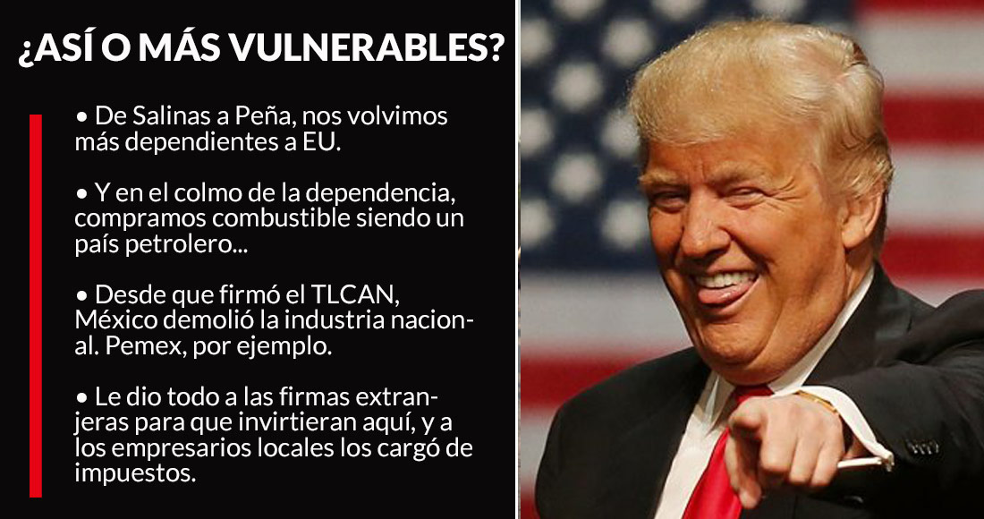 También dice que los funcionarios mexicanos piensan que la presidencia de Trump plantea dos peligros principales: “La primera es que los Estados Unidos renunciarán al TLCAN, lo que podrán hacer después de seis meses de aviso, o simplemente destrozarlo colocando barreras comerciales. El segundo es que, como una manera de forzar a México a pagar por el muro, Trump llevará a cabo su amenaza de bloquear las remesas de los inmigrantes en los Estados Unidos. Éstos inyectan unos 25 mil millones al año en la economía de México”.