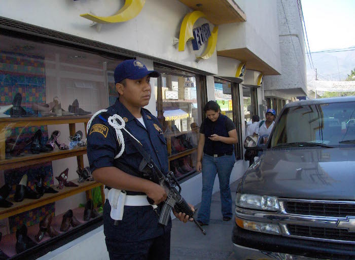 Integrantes de una banda del crimen organizado que se disputan “la plaza” en Guerrero acudieron a varios locales de Chilpancingo para amenazar a varios comerciantes de cobrarles derecho de piso. El presidente de la Canaco en Chilpancingo, Ortega Corona, afirma que el terror generalizado que se ha apoderado del sector económico en la capital inhibe y desalienta la inversión. Tras la advertencia de los delincuentes, los empresarios están planteando la posibilidad de tener armas en sus negocios, “un arma reglamentaria, autorizada por el Ejército”.