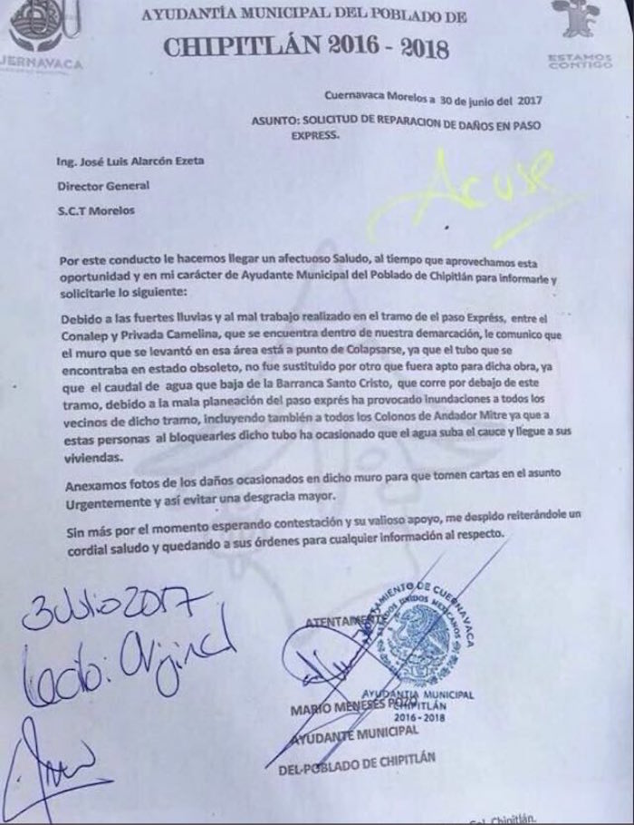 En una misiva, con fecha del 30 de junio y enviada por la Ayudantía Municipal del poblado de Chipitlán, en Cuernavaca, al delegado de la dependencia, José Luis Alarcón, se advirtió que "debido a las fuertes lluvias y al mal trabajo realizado en el tramo del Paso Exprés, entre el Conalep y Privada Camelina, que se encuentra dentro de nuestra demarcación, le comunico que el muro que se levantó en esa área está a punto de colapsarse".