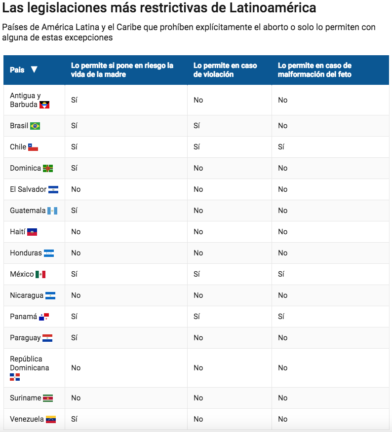 Las legislaciones más restrictivas, esto es, las que solo contemplan la legalidad del aborto en casos de violación o de que corra peligro la madre, son las de países como México, Venezuela, Brasil, Paraguay o Chile.