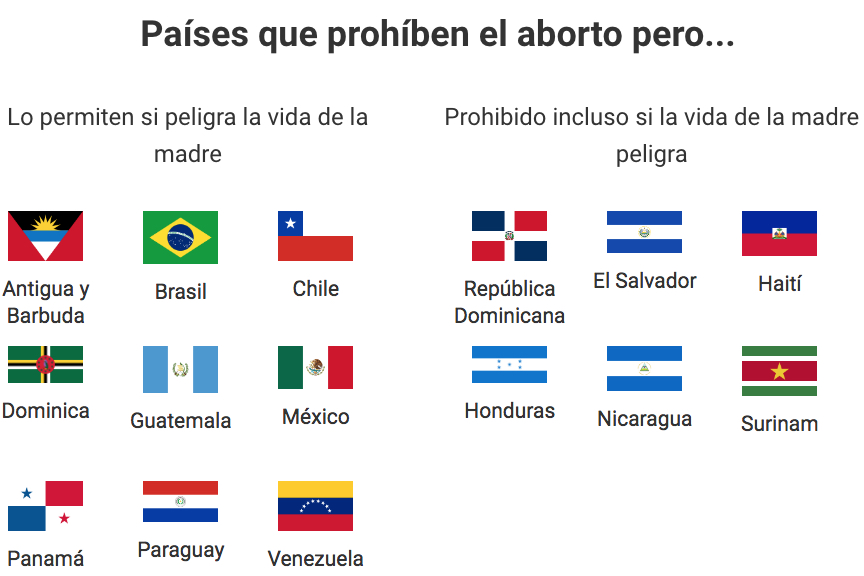 Dentro de los países que prohíben el aborto, es posible abortar si peligra la vida de la madre en Antigua y Barbuda, Brasil, Chile, Dominica, Guatemala, México, Panamá, Paraguay y Venezuela. No sucede lo mismo en República Dominicana, El Salvador, Haití, Honduras, Nicaragua y Suriname.