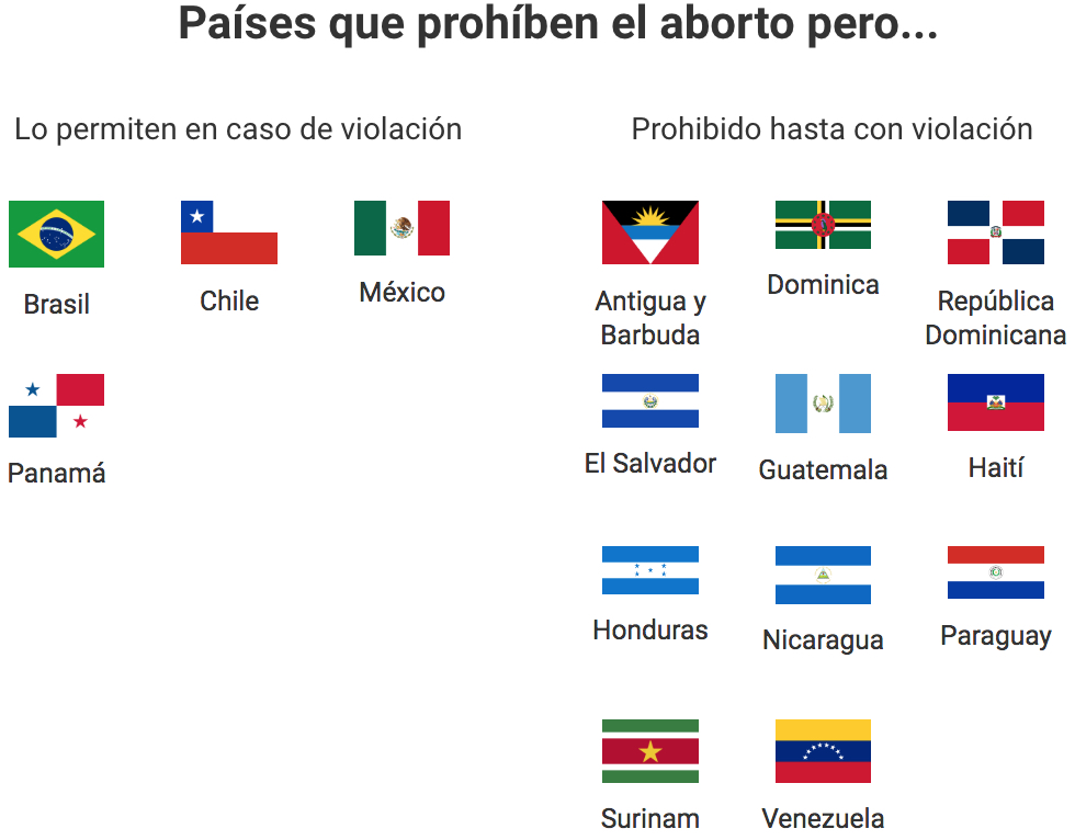 De los países que prohíben el aborto, Brasil, Chile, México y Panamá lo permiten en caso de violación. El resto lo prohíben incluso bajo este supuesto. En este punto, cabe recordar que en la Ciudad de México el aborto está despenalizado hasta las 12 semanas de gestación desde el año 2007. Esta competencia depende de los estados.