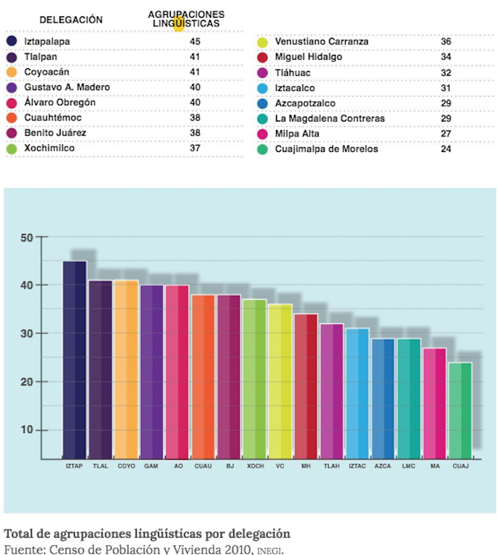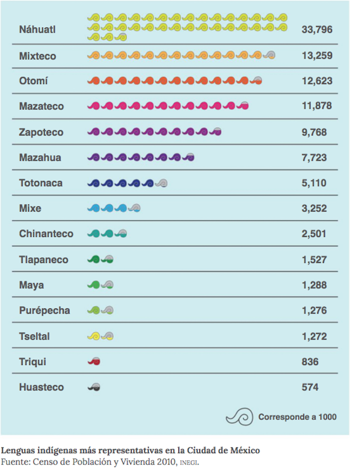 Según el diagnóstico, en la ciudad con una población total de 8.8 millones de habitantes se hablan 57 de las 68 lenguas originarias que existen en México, en su mayoría el náhuatl, mixteco, zapoteco, otomí, mazateco, mazahua y mixe.
