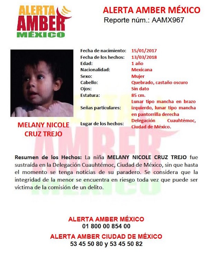 Ciudad de México, 13 de marzo (SinEmbargo).- Autoridades de la Ciudad de México activaron la Alerta Amber para Melany Nicole Cruz Trejo, una bebé de un año de edad, desaparecida en la Ciudad de México.