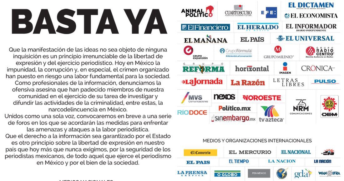 Titulado “Basta ya”, el pronunciamiento fue firmado por una cuarentena de medios de comunicación entre periódicos, cadenas de televisión, emisoras de radio y agencias de noticias.