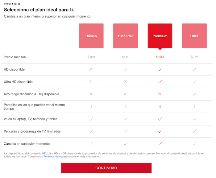 Con este cambio, Premiun perdió la tecnología HDR, si lo recuerdas, antes este plan se vendía así. Ahora sólo se quedará con defección 4K y sus cuatro pantallas simultáneas. Al menos por ahora, pues en países como Italia y el servício Premium ya sólo ofrecerá 2 pantallas a la vez.