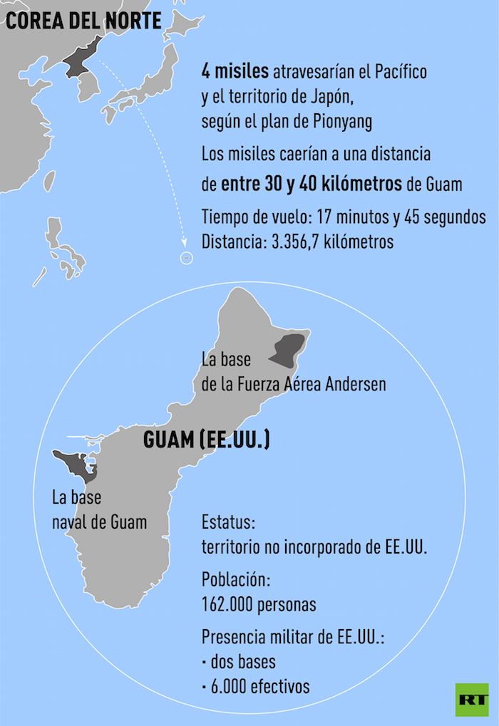 En días pasado Corea del Norte amenazó a EU con atacar a la isla de Guam. Gráfico: RT