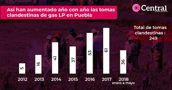 De 2012 a mayo de este 2018, Puebla ha reportado un total de 249 tomas clandestinas de gas, lo que coloca a la entidad como la segunda con mayor número de tomas a nivel nacional; en primer lugar se colocó el Estado de México, con 378, y en tercer lugar Querétaro, con 97.