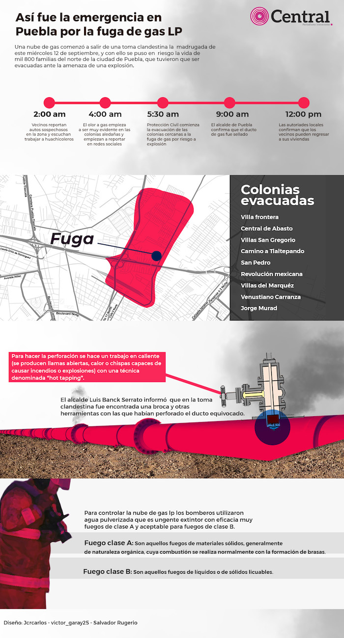 La madrugada de ayer, Pedro trabajaba alrededor de las dos de la madrugada del 12 de septiembre en su casa cuando escuchó “como si la llanta de un auto comenzara a desinflarse”. Pero en realidad se trataba de una la fuga Gas LP que tres horas más tarde provocó la evacuación de mil 800 familias en nueve colonias del norte de Puebla.