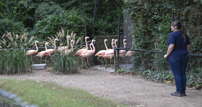 Empleada guía un grupo de flamencos hacia un refugio de concreto antes de la llegada del huracán Florence. Foto: Zoológico de Carolina del Norte en Asheboro, Carolina del Norte vía AP