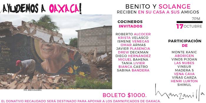 Una iniciativa de los chefs Solange Muris y Benito Molina para ayudar a los damnificados de los pasados sismos del mes de septiembre, en una cena en la que juntarán a sus amigos y mejores cocineros de la región como Javier Plascencia, Sabina Bandera, Miguel Bahena y Drew Deckman.