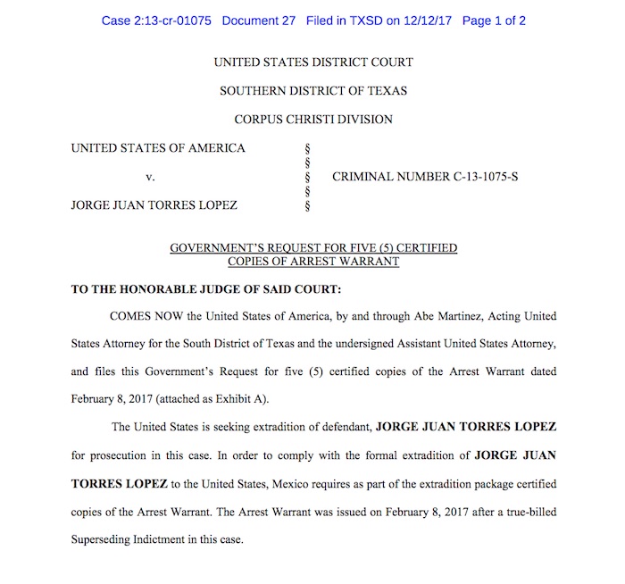 “Los Estados Unidos están buscando la extradición del acusado, Jorge Juan Torres López para su enjuiciamiento en este caso. Para cumplir con la extradición formal de JORGE JUAN TORRES LOPEZ a los Estados Unidos, México requiere como parte del paquete de extradición certificado, copias de la orden de arresto”, señala el documento.