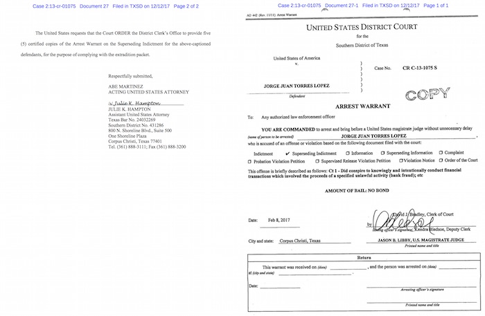 De acuerdo con un documento al que el diario local Vanguardia tuvo acceso, el Fiscal Abe Martínez, de una Corte del Distrito Sur de Texas, requirió ayer al Tribunal cinco copias certificadas de la orden de arresto que se emitió contra Torres López el pasado 8 de febrero, pues son necesarias para demandar su entrega.