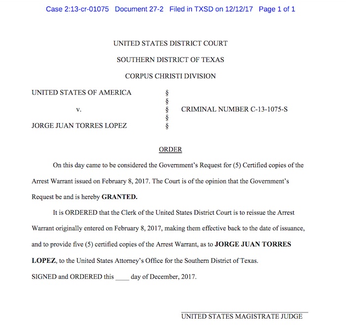 “Se ordena que el Secretario del Tribunal de Distrito de los Estados Unidos vuelva a emitir la orden de arresto que se ingresó originalmente el 8 de febrero de 2017, haciéndola efectiva hasta la fecha de emisión, y para proporcionar cinco (5) copias certificadas de la orden de arresto, en cuanto a JORGE JUAN TORRES LOPEZ, a la Oficina del Fiscal de los Estados Unidos para el Distrito Sur de Texas”, concluye el documento.