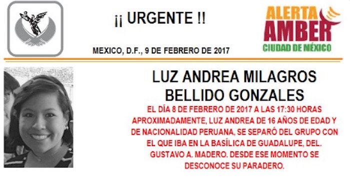 La adolescente desapareció cuando ingresó con sus padres Ivonne Gonzáles y José Bellido, su hermana y tíos a la basílica a las 17:30 horas del pasado miércoles 8 de febrero.