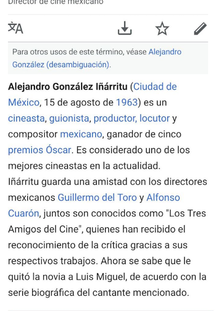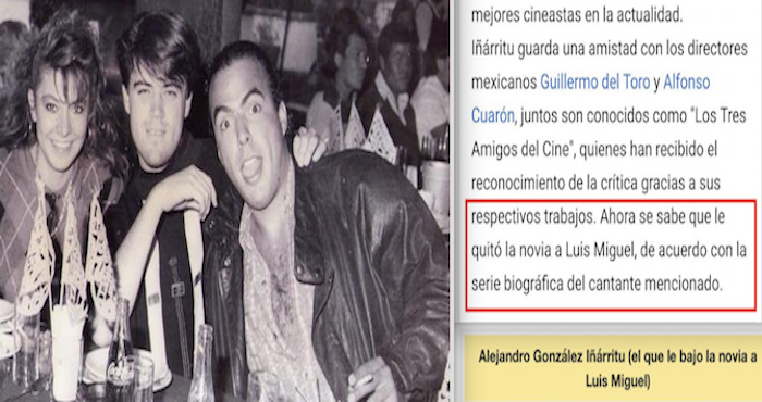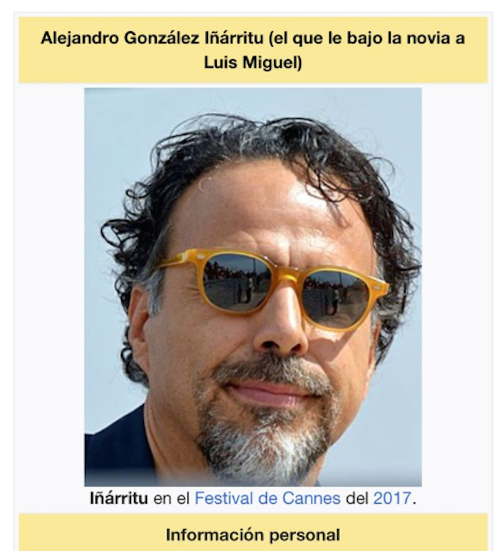 Esta información llevó a usuarios de Internet a modificar la enciclopedia digital colectiva Wikipedia y escribir entre paréntesis , en el recuadro amarillo arriba de la fotografía de González Iñárritu, la descripción “el que le bajó la novia a Luis Miguel”.