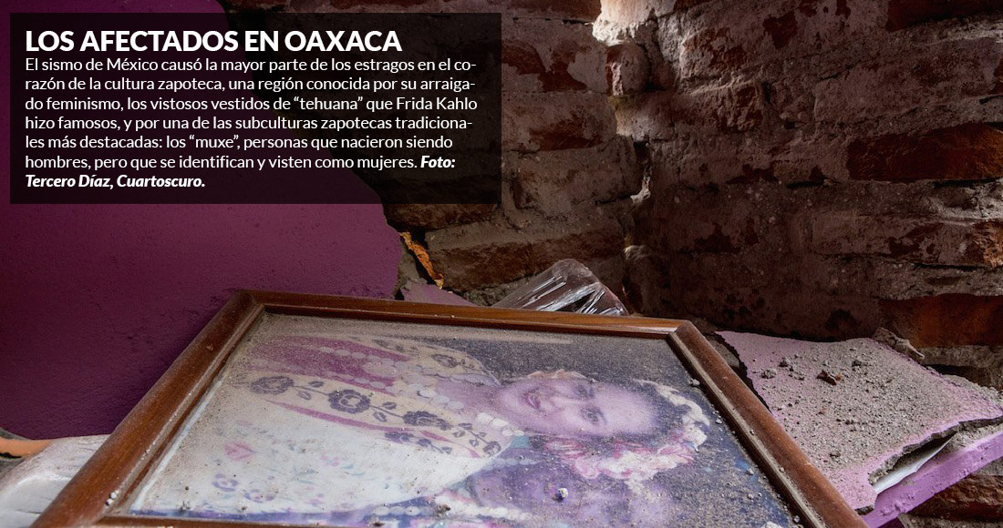 El sismo provocó la muerte de 98 personas en todo México, y causó la mayor parte de los estragos en el corazón de la cultura zapoteca, una región conocida por su arraigado feminismo, los vistosos vestidos de “tehuana” que Frida Kahlo hizo famosos, y por una de las subculturas zapotecas tradicionales más destacadas: los “muxe”, personas que nacieron siendo hombres, pero que se identifican y visten como mujeres y quienes son aceptadas, e incluso reconocidas, por sus contribuciones.