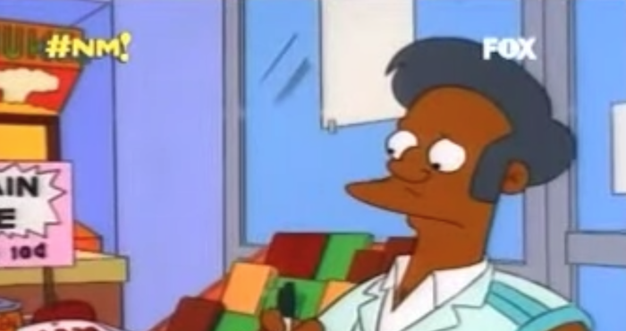 Entre los bebedores, los médicos incompetentes, los payasos y los intelectuales chiflados de Springfield había un personaje realmente bufonesco: Apu, el empleado del mercado Kwik-E-Mart que vendía alimentos caducos, estafaba a los clientes y los despedía con la cantilena “gracias, vuelva pronto”.
