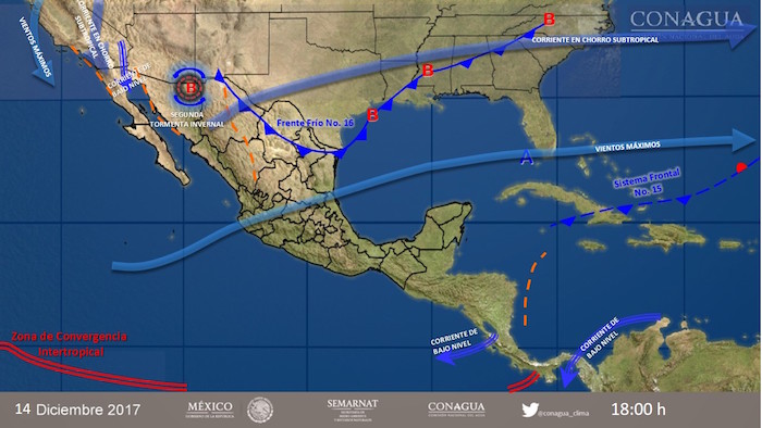 Ciudad de México, 14 de diciembre (SinEmbargo).- Esta noche entra la segunda tormenta invernal de la temporada, originada por frente frío número 16, que llevará lluvia y vientos acumulados muy fuertes para Chihuahua, Durango, Sinaloa y Nayarit, y fuertes en Coahuila, Nuevo León y Zacatecas.