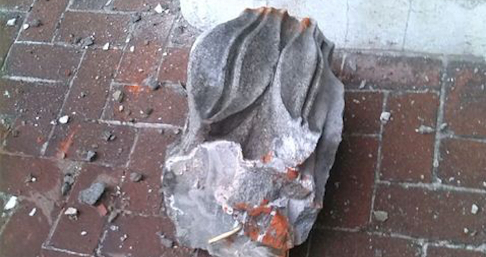 El día de hoy, el rayo impactó en la parte más alta de la torre, provocando que una guirnalda y un escudo se desprendieran y cayeran.