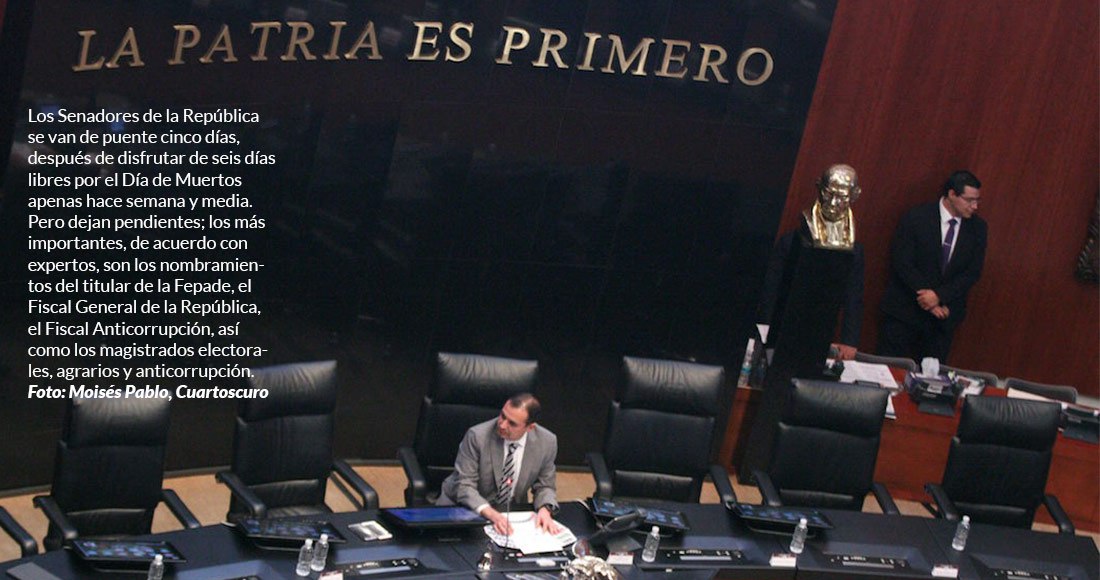Con el proceso electoral 2018 en marcha, los senadores se tomarán otro puente largo en noviembre sin sacar, de nuevo, el nombramiento del titular de la Fepade, del Fiscal General de la República, y del Fiscal Anticorrupción. Sin voluntad política, dicen los expertos, los legisladores violan el mandato Constitucional al no cumplir con su deber ni con una “mínima responsabilidad por su país”.