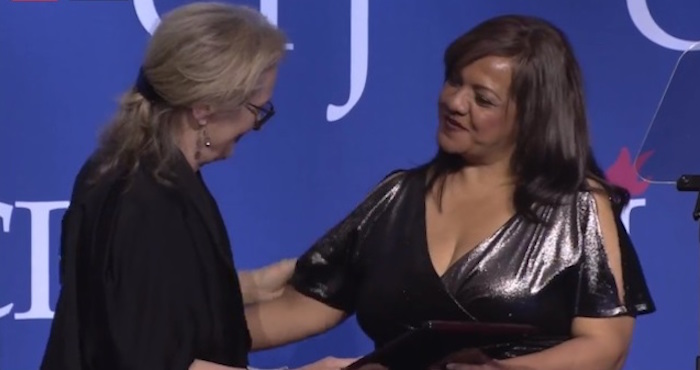 A manos de la actriz estadounidense, Meryl Streep, Mayorga recibió el galardón al Periodismo Valiente.