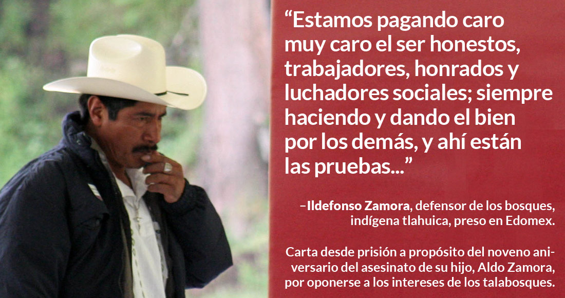 El ecologista Ildefonso Zamora, preso por cargos de robo, escribió una carta para recordar que hace 9 años taladores de bosques asesinaron a su hijo Aldo. En la misiva, difundida por la organización ecologista Greenpeace, afirma que su lucha y la de su familia por defender los bosques, no terminarán por su encarcelamiento ni las agresiones a su familia.