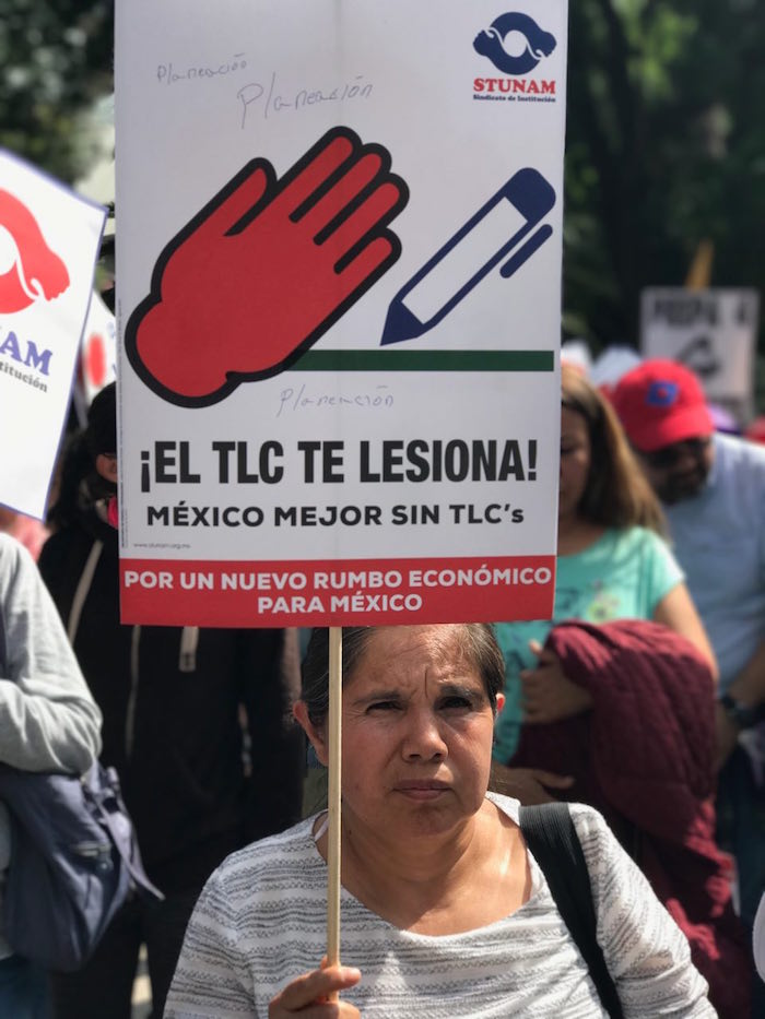Con pancartas en las que se leía "El TLCAN te lesiona", "México mejor sin TLC's" y "Por un nuevo rumbo económico para México", los manifestantes se dirigieron a las inmediaciones de la Secretaría de Relaciones Exteriores (SRE), ubicada en Avenida Juárez, colonia Centro.