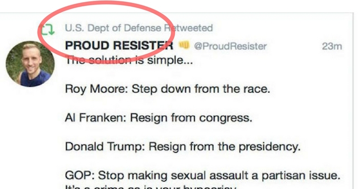 An authorized operator of the @DeptofDefense’s official Twitter site erroneously retweeted content that would not be endorsed by the Department of Defense. The operator caught this error and immediately deleted it.