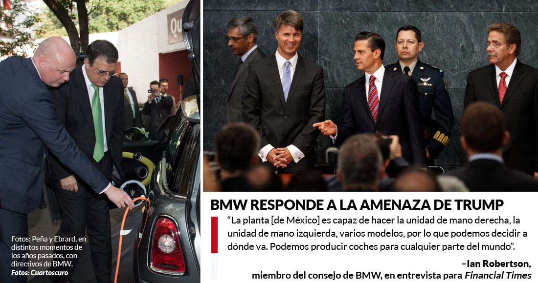 En el caso de la planta de BMW en SLP, a la cual Donald Trump también ha hecho señalamientos, comentó que los europeos llegan con otra estrategia de negocio y ellos utilizan a México como una plataforma mundial, y no nada más para exportar a EU. En México, además de la ventaja de la mano de obra, producir un vehículo para Audi o BMW les representa un ahorro de 3 mil a 4 mil dólares por unidad.