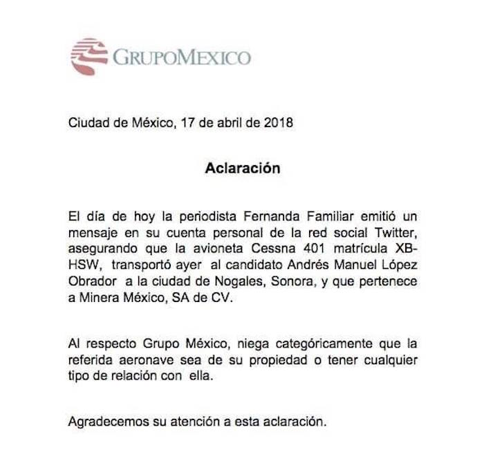 Tras la difusión de las imágenes, la periodista Fernanda Familiar había asegurado que la avioneta era propiedad de Grupo México. Posteriormente, el conglomerado negó “categóricamente” que la nave sea de su propiedad o “tener cualquier tipo de relación con ella”.