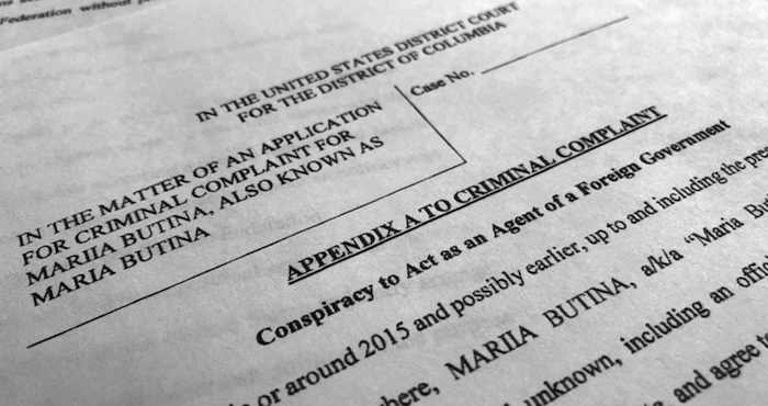 Los documentos judiciales que respaldan la detención de Butina la acusan de participar en una conspiración, que comenzó en 2015, en la que un alto funcionario ruso no identificado “le encargó” trabajar para infiltrarse en organizaciones políticas estadounidenses con el objetivo de “reportar a Moscú” sus hallazgos.