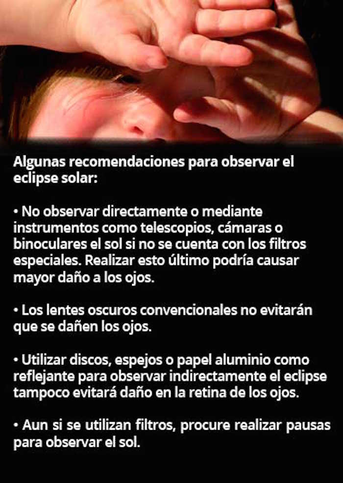 Astrónomos amateurs y profesionales —como la doctora Gloria Delgado— afirman que aunque el sol quede parcialmente oculto por la luna, la luz que llega a los ojos es muy intensa y puede quemar la retina. De la misma forma que ocurre con los telescopios o binoculares.