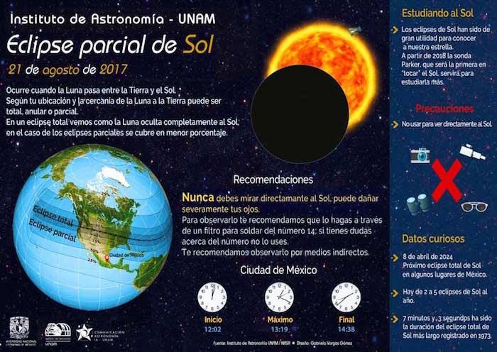 Observar el eclipse a través de telescopios con filtro en la Ciudad de México es posible y de forma gratuita en el Instituto de Astronomía de la UNAM donde, además de recibir una transmisión directa desde el Observatorio Astronómico Nacional en Ensenada, Baja California, se realizarán conferencias sobre el tema por parte de los investigadores de la universidad. También Universum, Museo de las Ciencias planea estas actividades al igual que el Planetario Luis Enrique Erro del Instituto Politécnico Nacional (IPN).