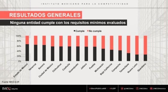 De acuerdo con el "Índice Legal de Obra Pública. Evaluación de la calidad del marco jurídico estatal", Veracruz, Estado de México, Sonora, Ciudad de México, Chihuahua, Coahuila, Guanajuato, Jalisco, Puebla, Michoacán, Baja California, Campeche, Tamaulipas, Nuevo León y Querétaro, son las entidades reprobadas.
