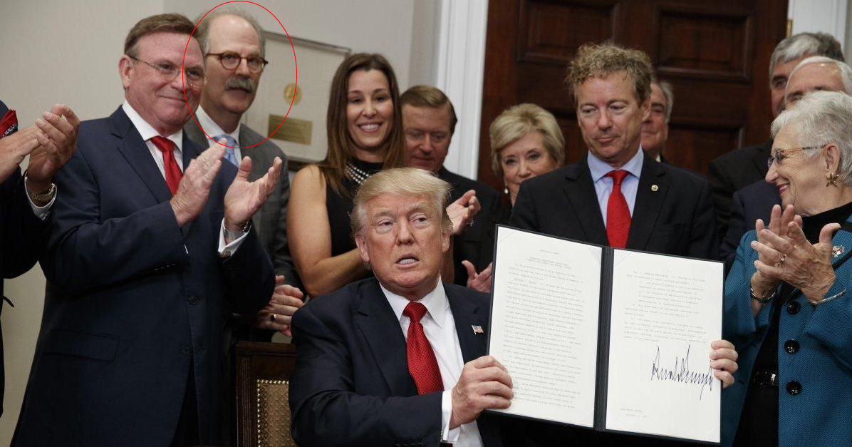 El empresario aparece en la fotografía conmemorativa sonriente y aplaudiendo detrás de Trump, quien firma el documento.