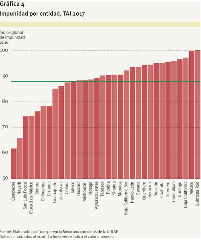 Respecto a solo impunidad, el cáncer de todo el país según el estudio, destacan Yucatán, Veracruz, Tabasco, Jalisco y Guanajuato, estado donde la inseguridad se ha incrementado.