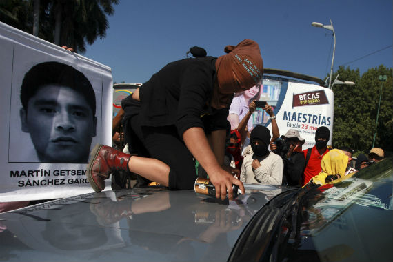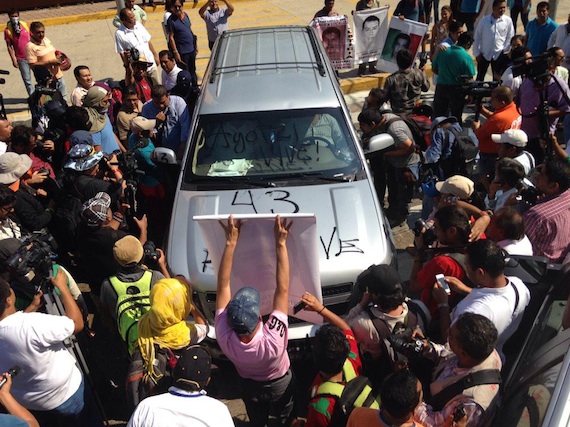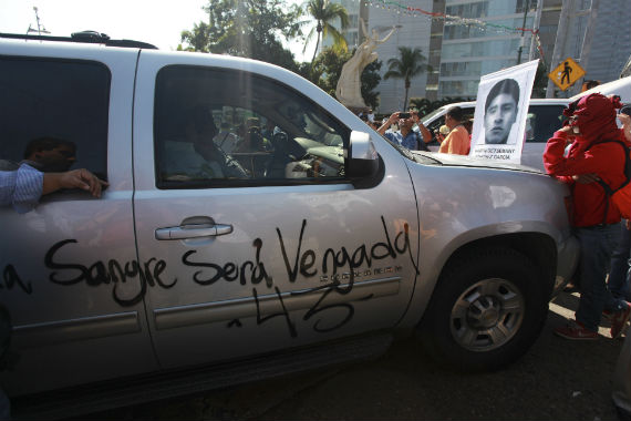 El vehículo del Edil fue rayado con las leyendas: "El pueblo organizado vencerá", "Fue el Estado", "Ayotzinapa Vive".